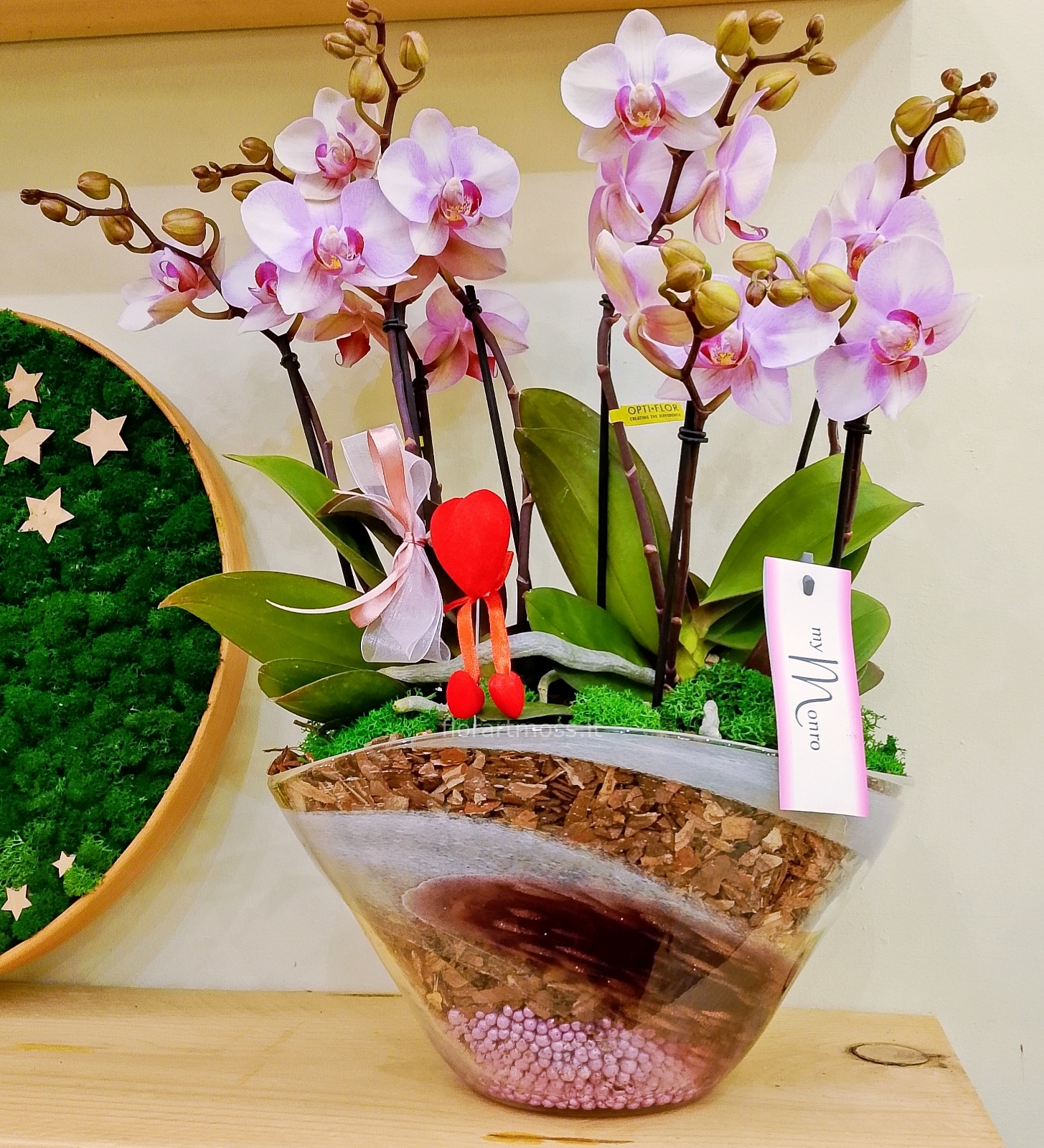 Composizione ( 50 x 50 cm ca.) con due pregiate Phalaenopsis "My Monro" pink a 4 rami ciascuna in elegante vaso di design in vetro le cui tonalità richiamano le particolarissime sfumature dei petali dei fiori.