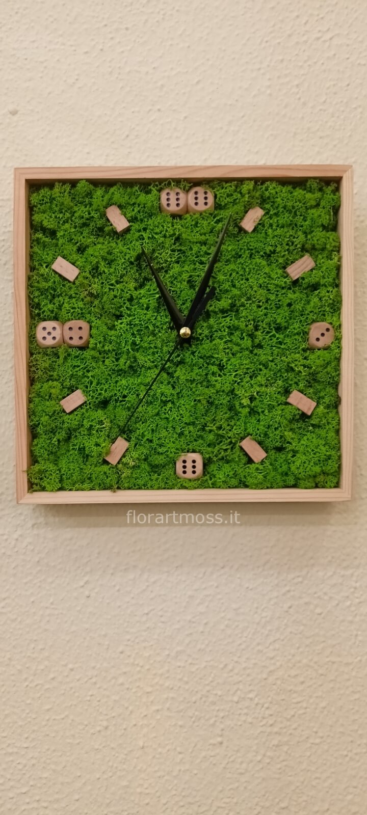 Orologio di lichene stabilizzato color verde lime, con cornice color legno e numeri realizzati con dadi da gioco.